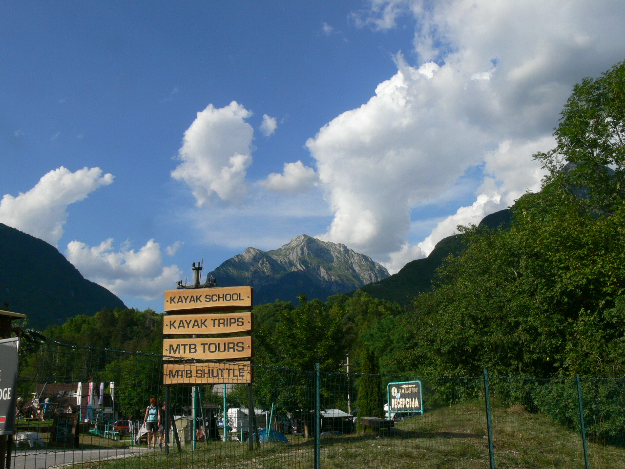 protože nebylo kde zastavit. Parkoviště bylo plné a navíc tam opravovali silnici. Tak, že pokračujeme hornatou krajinou do Slovinska směrem na Bovec. Tady doplňujeme pohonné hmoty (na tachometru je 106 939 a platíme 67 euro) a jedeme hledat kemp u řeky Soči.