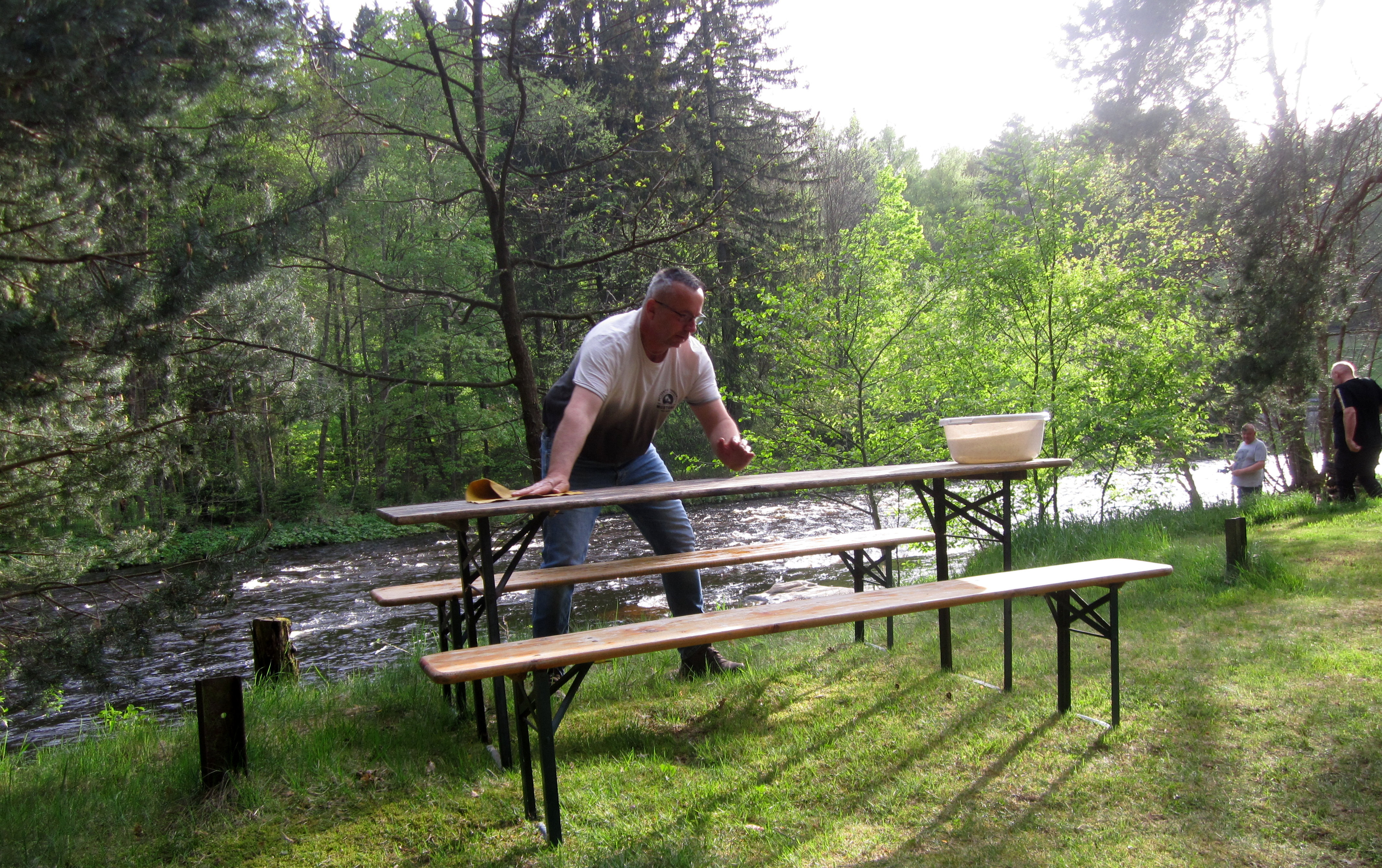 středa 1.5. Je 1. máj ráno když se vyloupnem Rada připravuje česnečku k snídani, tak se mu snažíme pomáhat. Po snídani nasedáme do citrona a jedeme dolu do Sušice. Tady nafukujeme lodě a jdeme na vodu. Cesta je fajn až k jezu u Podrabskému mlýnu, kde zmizela voda a lodě musíme chvílema táhnout za sebou. Po 700 metrech se nám voda vrací a zase cesta pokračuje v pohodě. Plánujeme doplout do Horažďovic, ale ve Velkých Hydčicích začíná foukat silný protivítr a když z řeky vidíme nádraží tak přistáváme. Sbalíme lodě a jdeme na vlak a za deset minut nám jede do Sušice kde na nás čeká auto, popojíždíme do Do Dlouhé Vsi k hospodě. Tady uděláme komedii když 7 chlapů vyleze s jednoho auta. Dáváme si tady oběd a pokračujeme do tábořiště a pomalu začneme připravovat večeři. Budou vařená kolena na ohni, trvá to sice skoro 3 hodiny, ale chutnají dobře a máme připravený vývar na snídani. Po večeři jdeme k ohni, hraje tady kytara a harmonika nálada je výborná. Spát jdeme až po půlnoci. Bach u táboráku € |