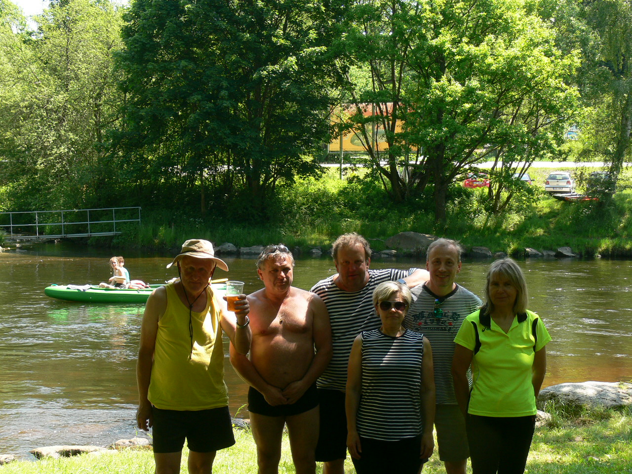 Za chvilku přijela vlakem druhá skupina, dofukujeme rafty a v momentě jsme ne vodě. Vody teče tak akorát zhruba 13 kubíků. Sestava ještě není kompletní, z Vyššího Brodu vyjíždíme na dvou raftech, Jitka s Pepou se připojí až večer na Pískárně. Do našeho raftu zatím sedáme s Pepou a Liborem. Od začátku je jasné, že mrzoutovo raft nebude stíhat, jsou asi moc těžcí. Máme trpělivost a tak na ně u piva počkáme.